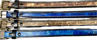 Crafted by hand, our Bubble Belts feature a unique bubble painted design and are available in blue or brown. With a sturdy buckle, double snaps, and a keeper, these belts provide both style and functionality. Elevate your wardrobe with our artisanal and customizable belts. No two colors will be alike. The shade and actual colors of the belts will vary.
