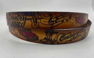 Crafted from 9oz veg tanned cowhide, this 1 1/2 inch wide belt features an embossed Country Music scene, hand painted for a unique touch. Easily change the buckle with a single snap. Add 2 inches to your pant waist size for a perfect fit. Elevate your style with this high-quality, one-of-a-kind leather belt.