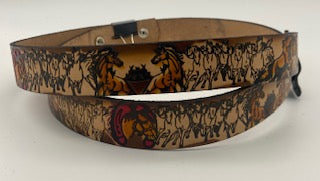 This Horse scene embossed leather belt is hand painted for a unique design. Made from 9oz Veg tanned cowhide, it is durable and long-lasting. The sturdy brass buckle has a single snap for easy changing. Perfect for adding a touch of equestrian style to any outfit.