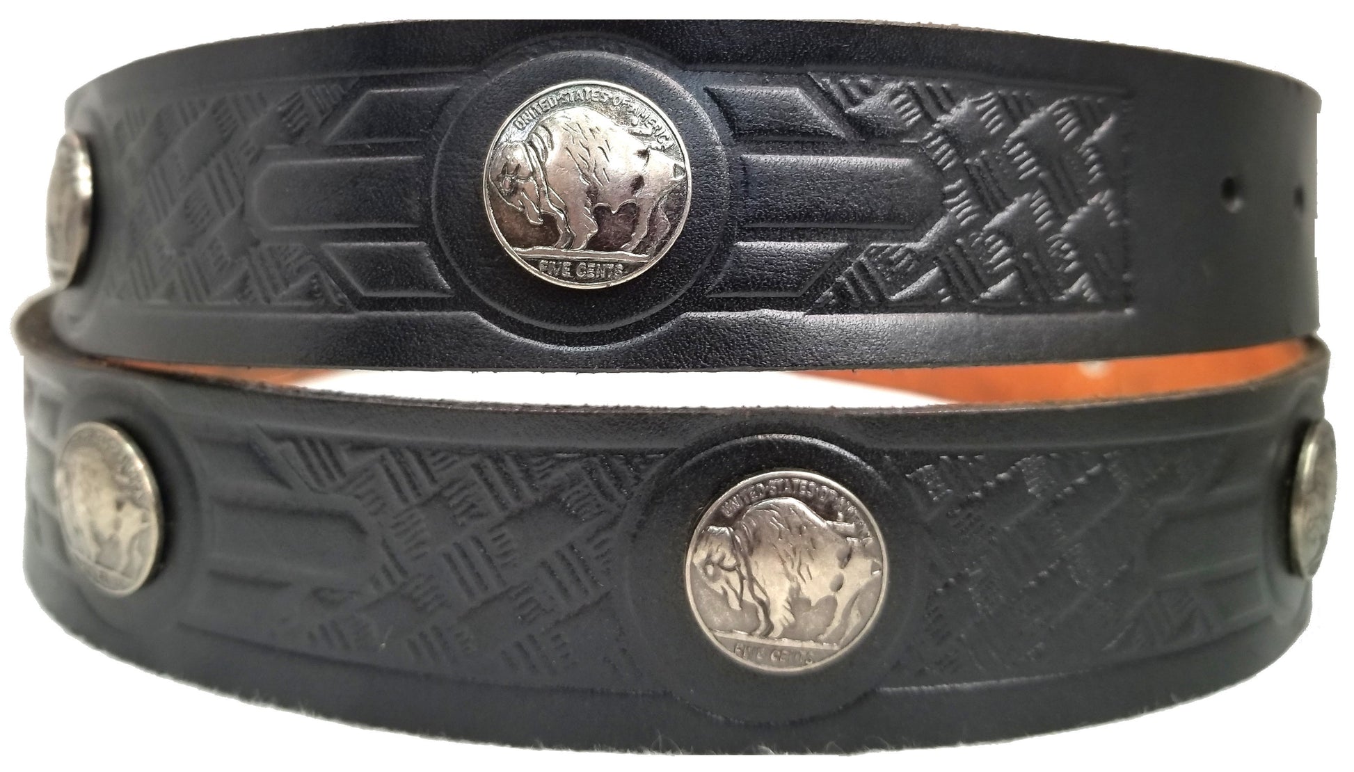 This genuine leather belt features an intricate basket weave embossed design, highlighted by medallion accents. Made from 9oz veg tanned cowhide, it is durable and stylish. Its 1 1/2" width accommodates a variety of belt buckles and the single snap allows for easy changing. Upgrade your wardrobe with this unique statement piece.