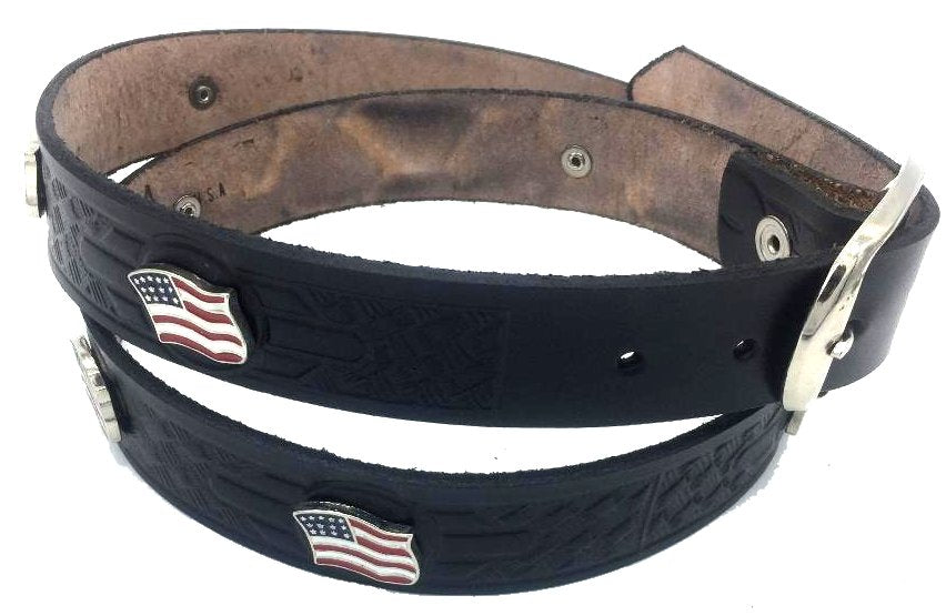 Expertly made with 9oz veg tanned cowhide, this American Flag Medallion Belt is a standout addition to any outfit. The 1 1/2" width and basket weave embossed design add a touch of texture, while the center bar buckle and snap closure make for easy, customizable wear. Elevate your style with this statement piece.