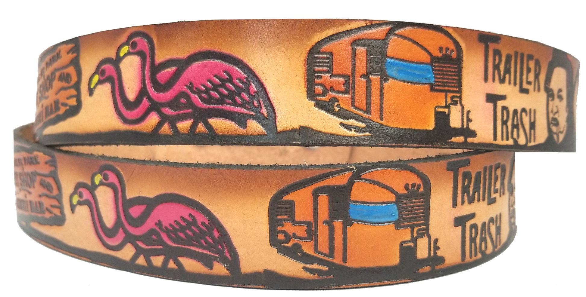 Crafted with 9oz veg tanned cowhide, this 1 1/2 inch wide embossed leather belt features a hand painted Trailer Trash scene. The center bar buckle and single snap make it easy to change buckles, adding versatility to your wardrobe. Upgrade your style with this unique and durable accessory.