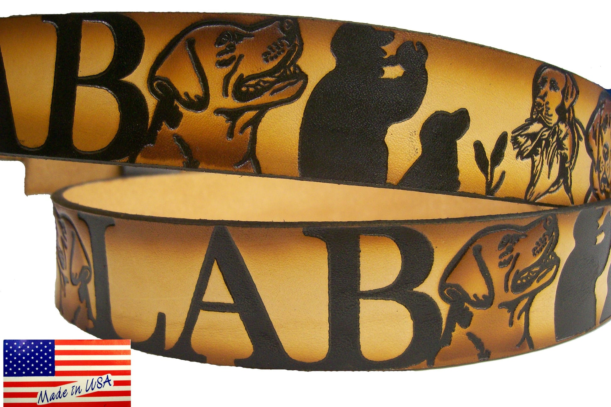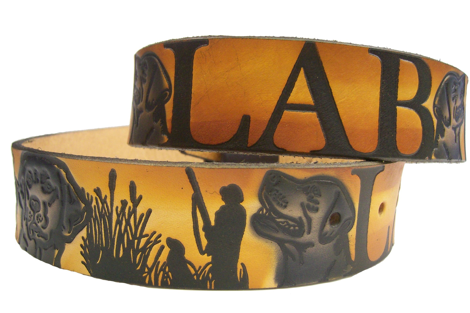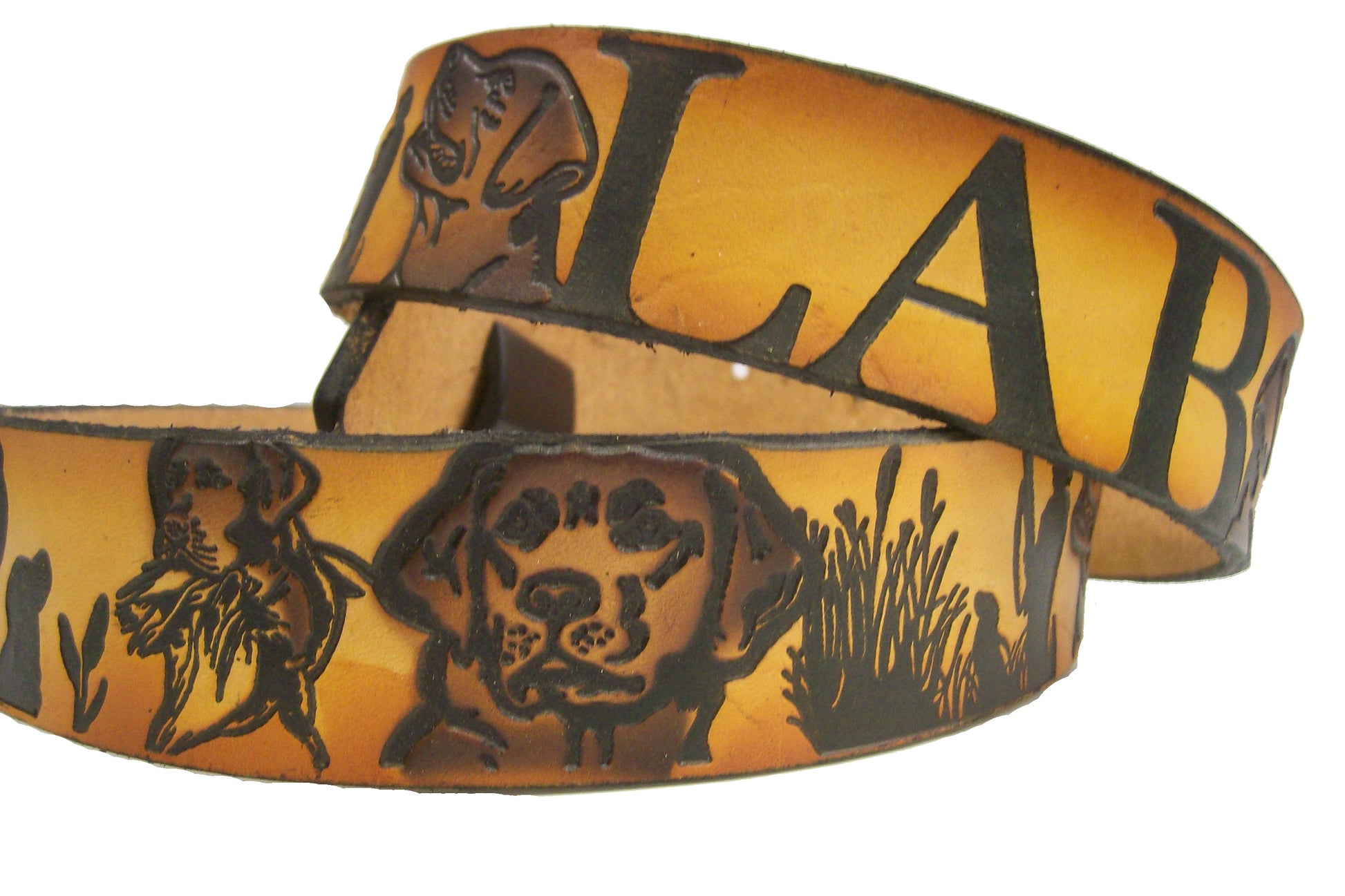 Expertly crafted and hand-painted, our Labrador scene embossed leather belt is made from 9oz veg tanned cowhide for durability. The 1 1/2 inch width with a center bar buckle offers a perfect fit. Easily change out buckles with the single snap design.