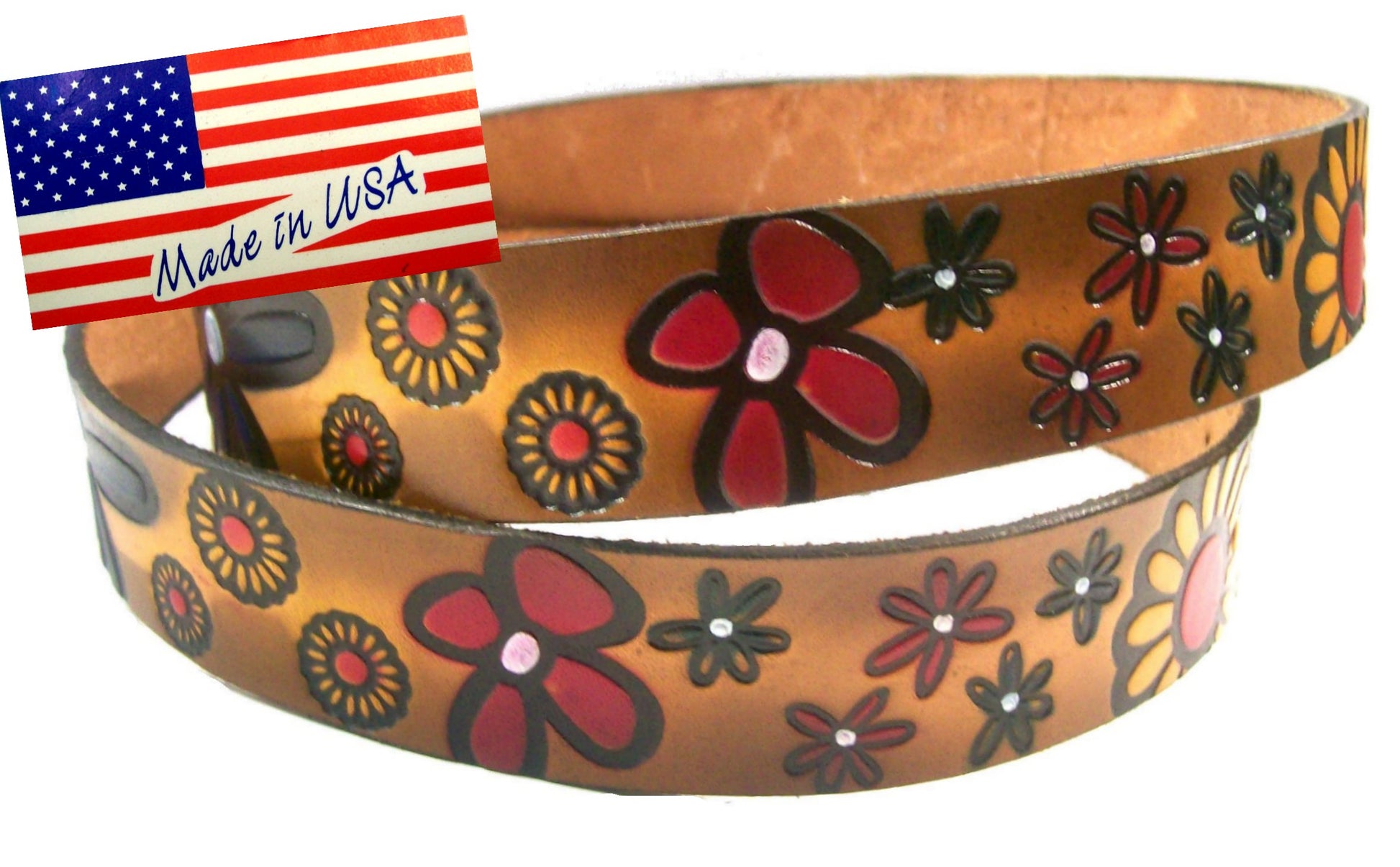 This artisanal belt features hand-painted flowers on embossed leather, made with high-quality 9oz veg tanned cowhide. At 1 1/2 inches wide and with a center bar buckle, it is both stylish and versatile. The single snap allows for easy buckle changing, making it a practical addition to any wardrobe.