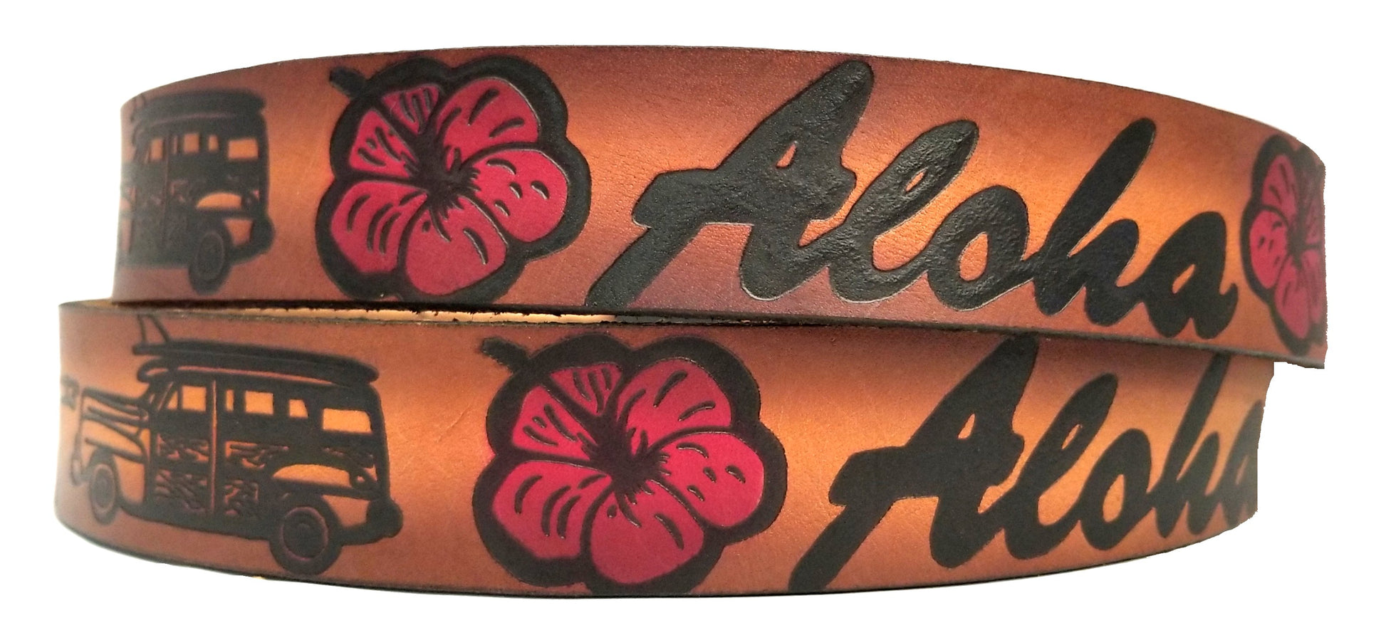 Aloha painted scene embossed leather belt