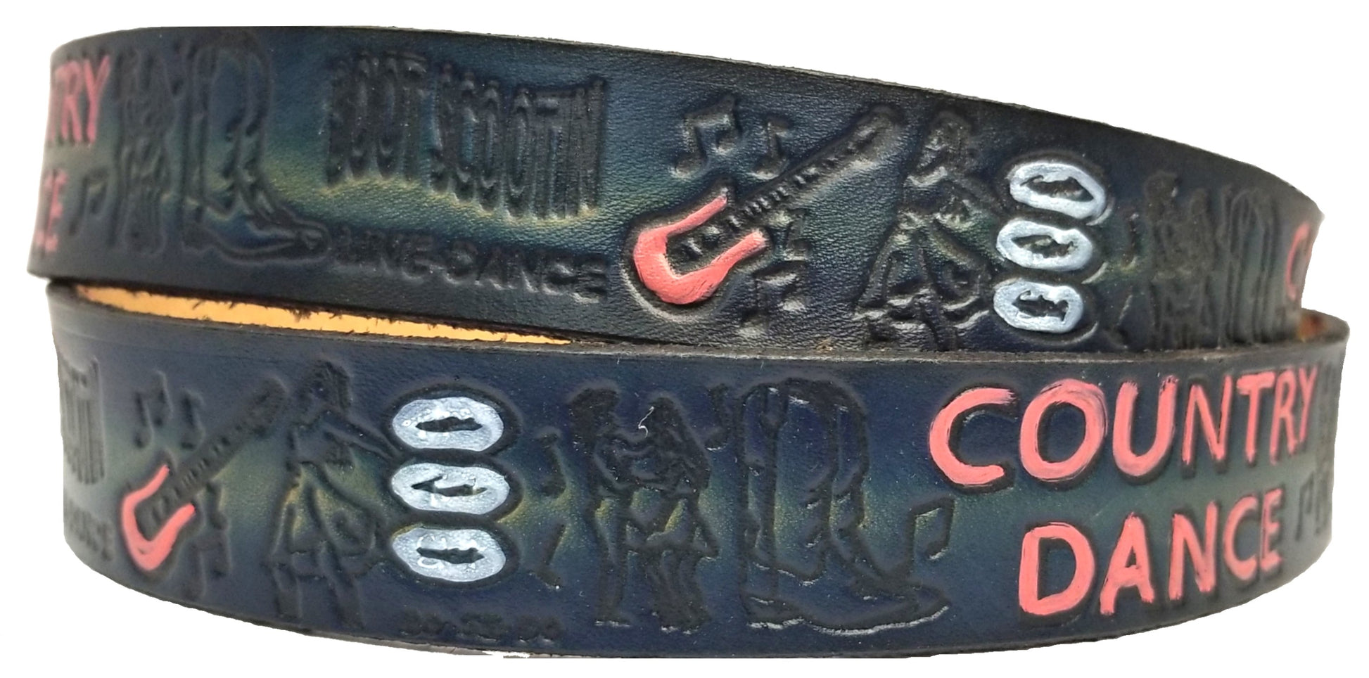 Expertly hand painted and crafted from 9oz veg tanned cowhide, this country dance embossed leather belt is a unique addition to any wardrobe. The 1 1/2 inch width and center bar buckle provide a comfortable fit, while the single snap allows for easy buckle changing. Elevate your style with this one-of-a-kind accessory.