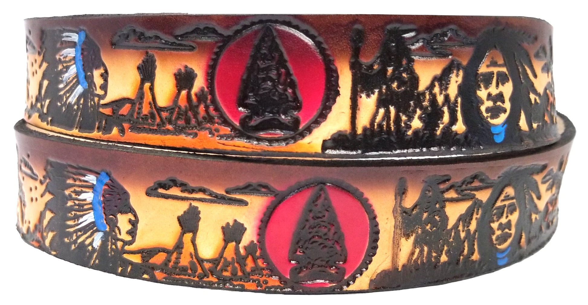 This Indian scene embossed leather belt is hand painted on 9oz veg tanned cowhide, providing a unique and detailed design. At 1 1/2 inches wide with a center bar buckle and single snap for easy buckle changing, it offers both style and convenience.