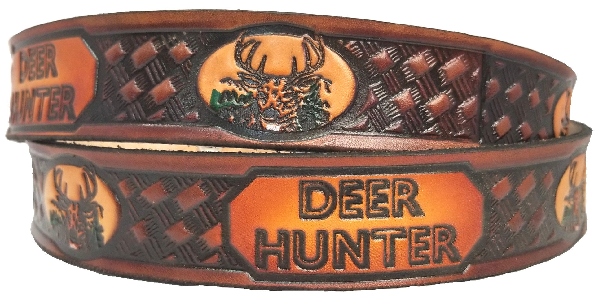 The Deer Hunter scene embossed leather belt is crafted from 9oz Veg tanned cowhide and features a hand-painted design. This 1 1/2 inch wide belt includes a center bar buckle and a single snap for easy buckle changing. Expertly made with high-quality materials, this belt is both durable and stylish.