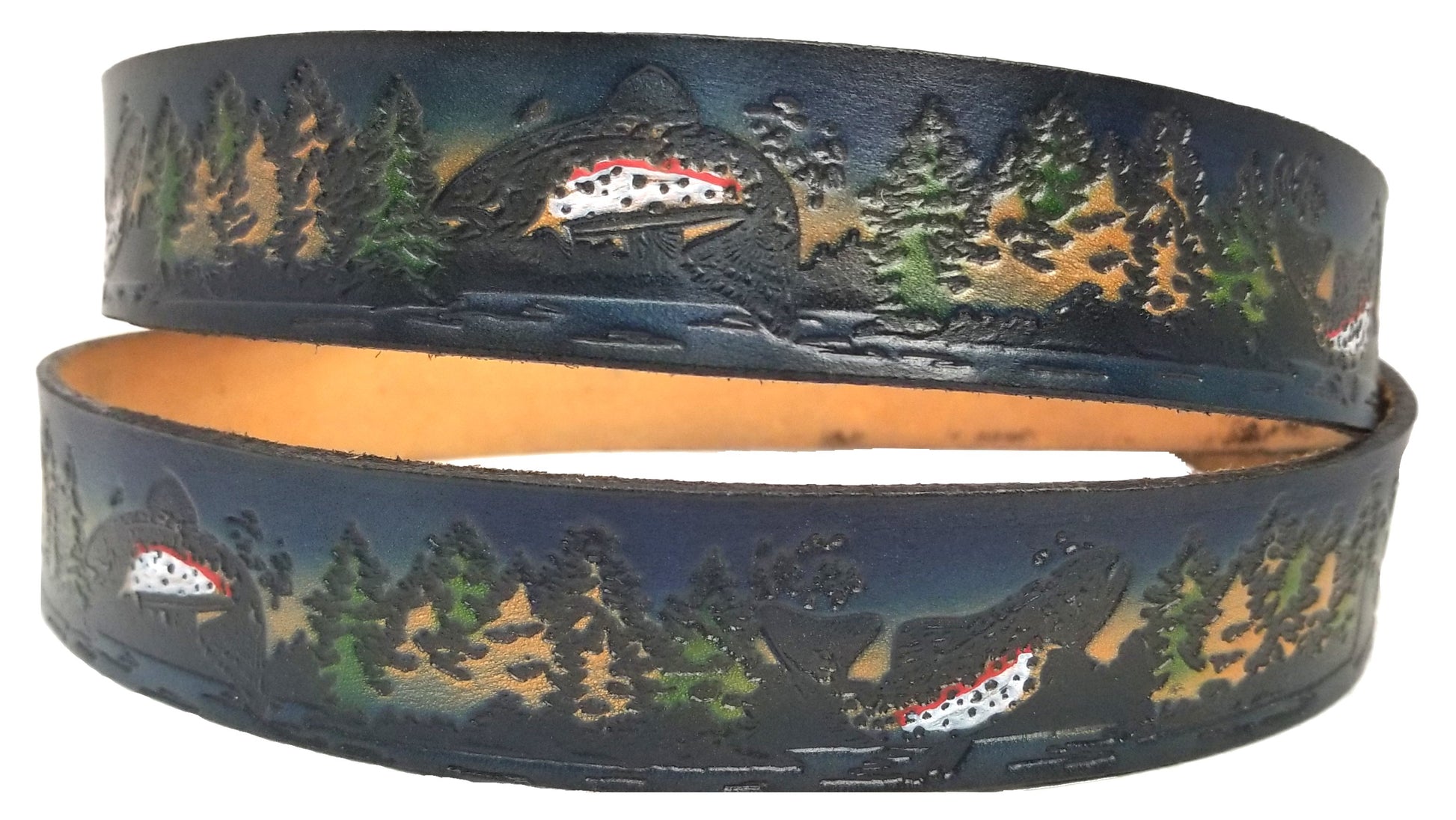 Fishing painted scene embossed leather belt