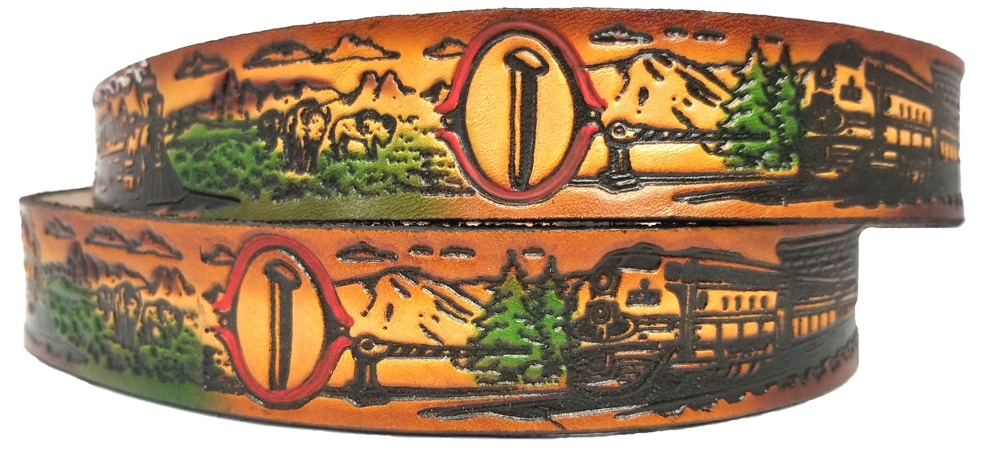 Expertly crafted from 9oz veg tanned cowhide and hand painted, this Train scene embossed leather belt is both stylish and functional. At 1 1/2 inches wide, it features a center bar buckle and single snap for easy buckle changing. Add a touch of unique and durable charm to your wardrobe.