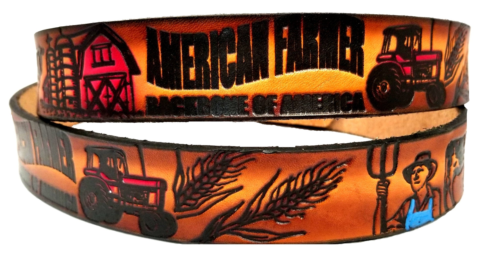 This Farmer scene embossed leather belt is hand painted and made of 9oz Veg tanned cowhide. It is 1 1/2 inches wide and features a center bar buckle and single snap for easy buckle changing. Add a touch of artistry to your wardrobe with this durable and versatile belt.