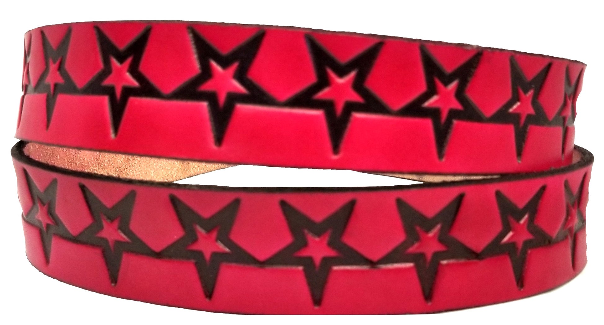 Hand painted and made from high-quality 9oz veg tanned cowhide, the Star Belt in Red is a must-have accessory. The 1 1/2 inch wide belt features a center bar buckle and single snap for easy buckle changing. Give your outfit a touch of personality with the beautiful embossed leather design.