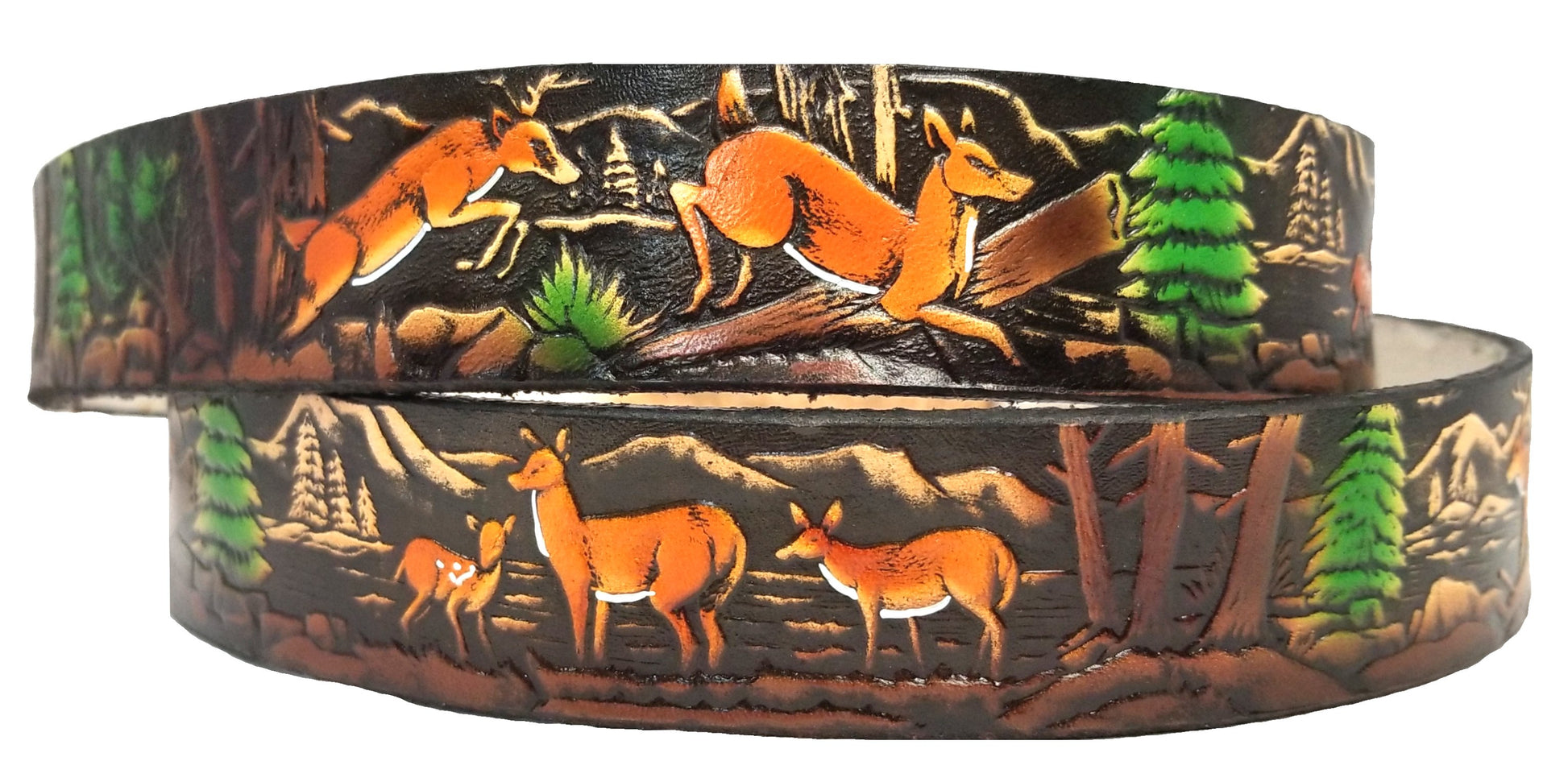 Upgrade your style with our Deer Scene Embossed Leather Belt! Made of 9oz Veg Tanned Cowhide, this 1 1/2 inch wide belt features a hand-painted deer scene for a unique touch. The center bar buckle and snap closure make it easy to change buckles, giving you endless options to match any outfit. Elevate your look with this high-quality, one-of-a-kind belt.
