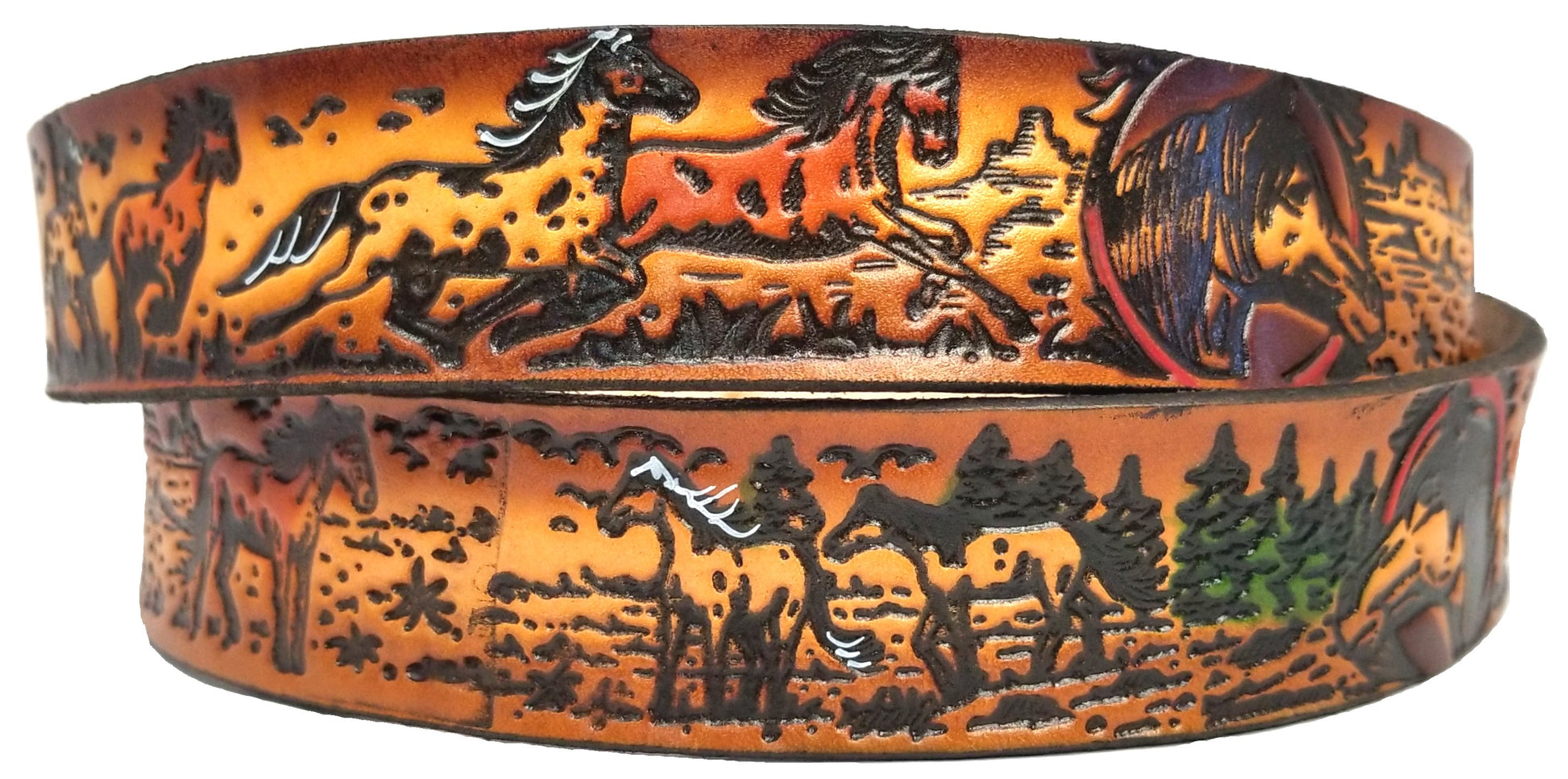 Expertly crafted, this Horses scene embossed leather belt features a one-of-a-kind hand painted design. Made with 9oz Veg tanned cowhide, it boasts durability and style. With a single snap for easy buckle changing, it's the perfect accessory for any equestrian enthusiast.