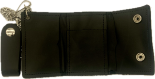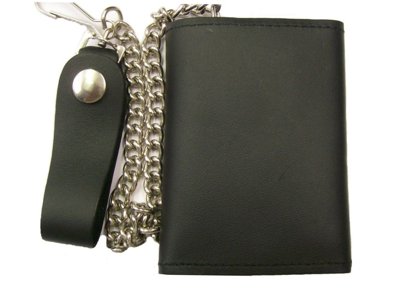 This leather trifold chain wallet is expertly crafted in the USA, guaranteeing top quality and durability. With three sections to organize your cards and cash, and a secure chain to attach to your belt loop, it combines functionality with style. Upgrade your wallet game with this American-made essential.